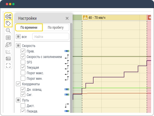 В верхней части окна-панели настроек находятся две кнопки выбора параметра по которому будут отображаться графики на оси Х: по времени или по пробегу.